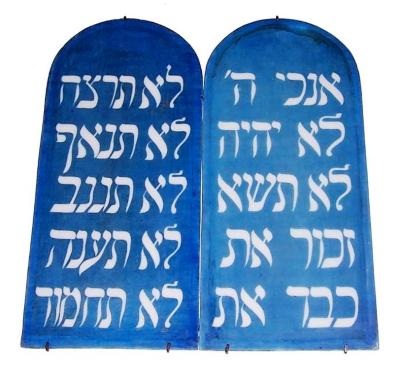 caption:Ten Commandments remain white on hand-painted, blue surface.