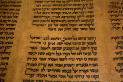 This image depicts the correction that was made in one of the lines on this particular Sefer Torah, rendering it not Kosher. The Hebrew letters in the script are also cracked and broken; this is also another reason why a Sefer Torah could be considered no longer Kosher.