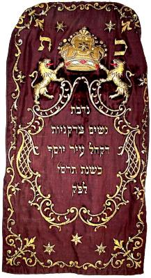 Burgundy brushed velvet mantel, embroidered with a heavy three-dimensional crown with blue and red embroidered jewels. Heavy gold metallic thread embroidered in rococo scrolls frames the rectangular face panel, and surrounds the Hebrew dedication text (See Remarks, below, for translation). The crown is supported by the paws of intricately embroidered lions. Five six-pointed stars and the acronym for "Crown of the Torah" complete the design.