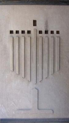 Two limestone slabs with contemporary nine-branched stylized menorah in bas-relief. Each "arm" is topped by a two-inch-square opening, through which an illuminated bulb could broadcast the specific Chanukah night.