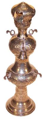 These ornaments are used to top the Torah staves (called atzei chaim or “trees of life”) on which the Torah is rolled. They are known as rimmonim (pomegranates) presumably with reference to that fruit’s many seeds, corresponding to the many laws contained in the Torah, or tappuchim (apples). In Spanish and Portuguese synagogues, they are also called “bells” because of the bells often attached to them. First mentioned in 12th century texts, they earliest extant examples of Torah finials are a late 15th century pair now in the cathedral of Palma de Mallorca. Needless, to say they are the objects of artistic attention, and have been crafted in many and various ways.