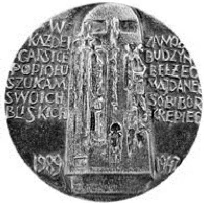The front/obverse depicts the Monument to the Victims, located in Lublin, Poland. The shape of the memorial resembles the shape of a tombstone (matzevah). The left side of the monument has the inscription in Polish, “In each handful of ashes I search for my relatives 1989”. On the right side of the monument, are listed the names names of the work and extermination camps, to which the Lublin Jews were transported during the occupation: Bełżec, Sobibór, Majdanek, Budzyń, Zamość and Krepiec and the date, 1942 (the year of the extermination of the ghetto in Lublin.)